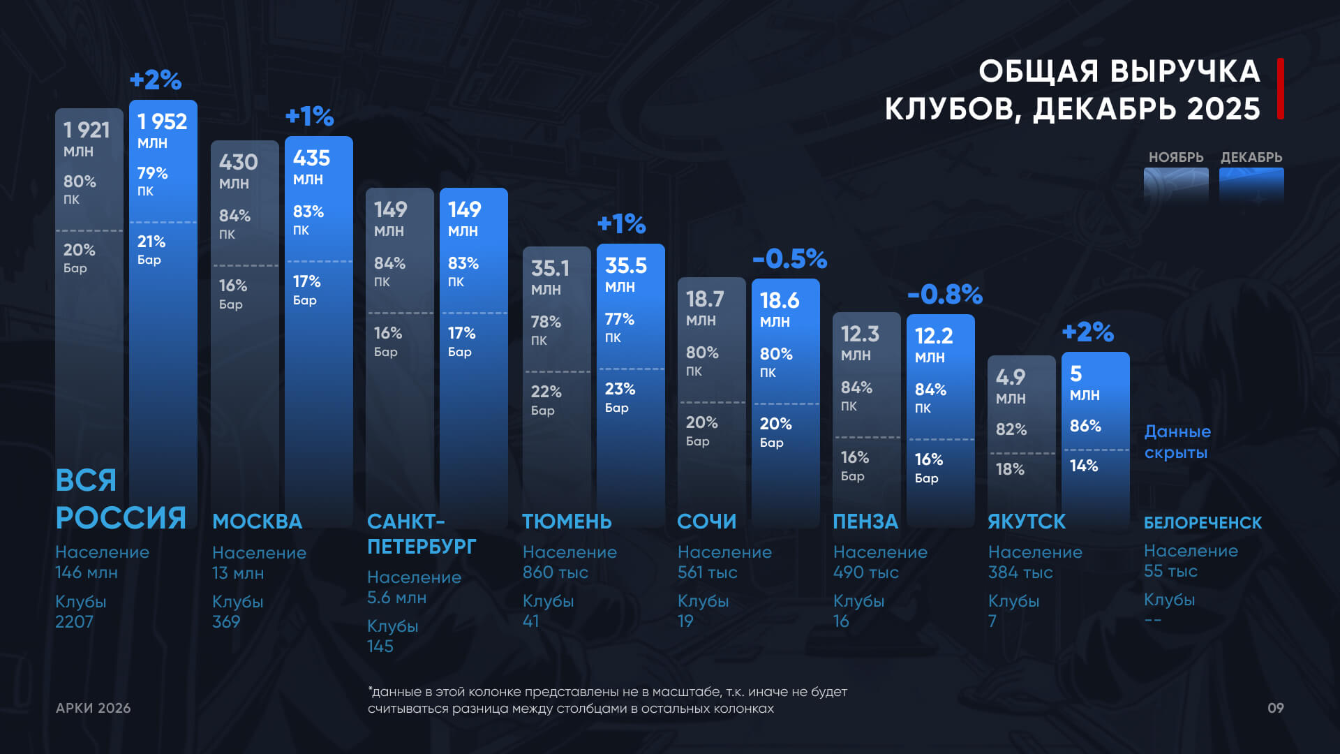 Регионы по-прежнему в тренде. Там, в отличие от мегаполисов, число имеющихся и открывающихся клубов пока не удовлетворяет спрос геймерской аудитории. При этом финансовые показатели многих региональных клубов уже сопоставимы с выручками в больших городах при меньших затратах на открытие. Это подтверждает, что аудитория в регионах охотно посещает современные площадки и готова проводить там свой досуг. Потенциал регионального рынка не исчерпан, у него хорошие перспективы.