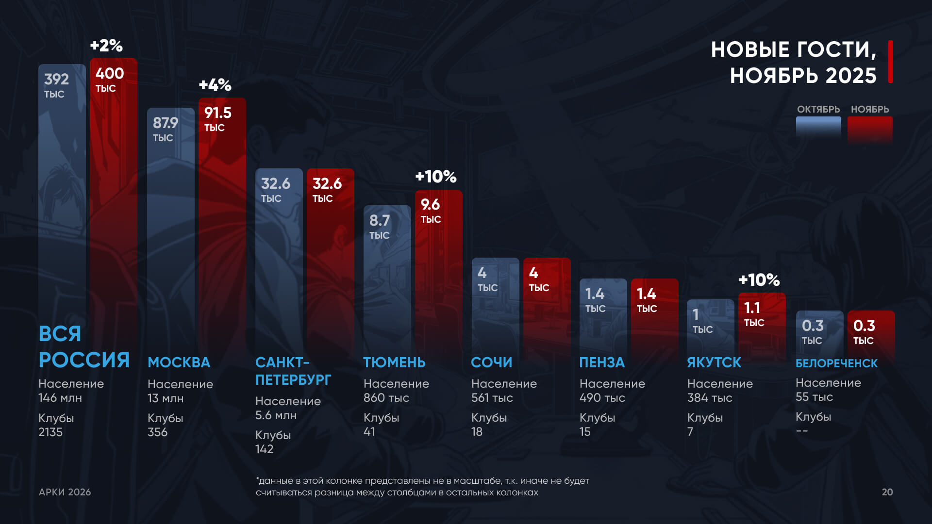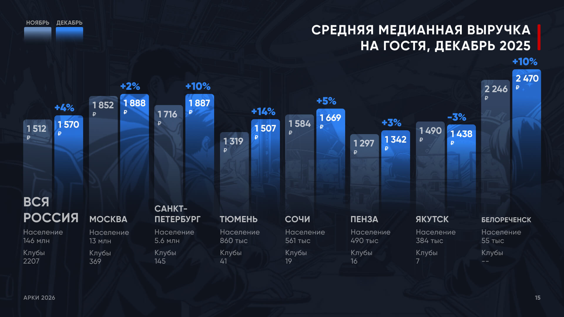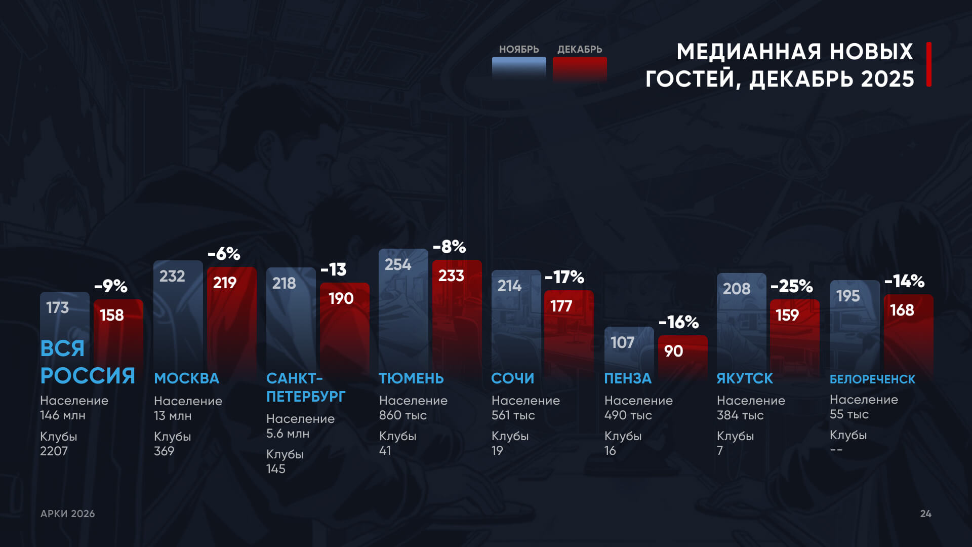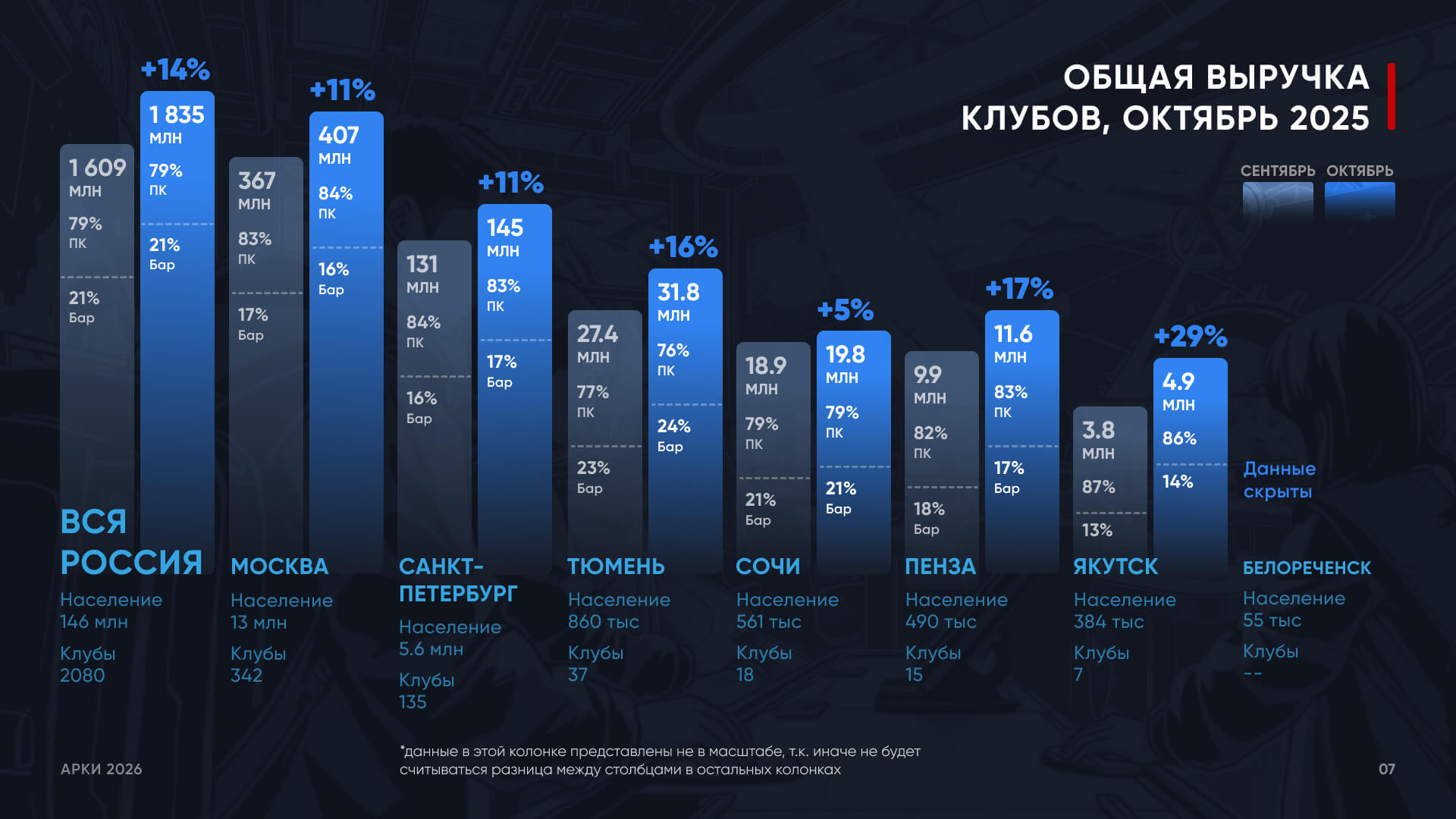 В клубах в маленьких городах гости могут тратить столько же, сколько и в мегаполисах. Это объяснимый тренд, т.к. в небольших городах выбор досуговых площадок ограничен, и жители активнее проводят время в любимых клубах.