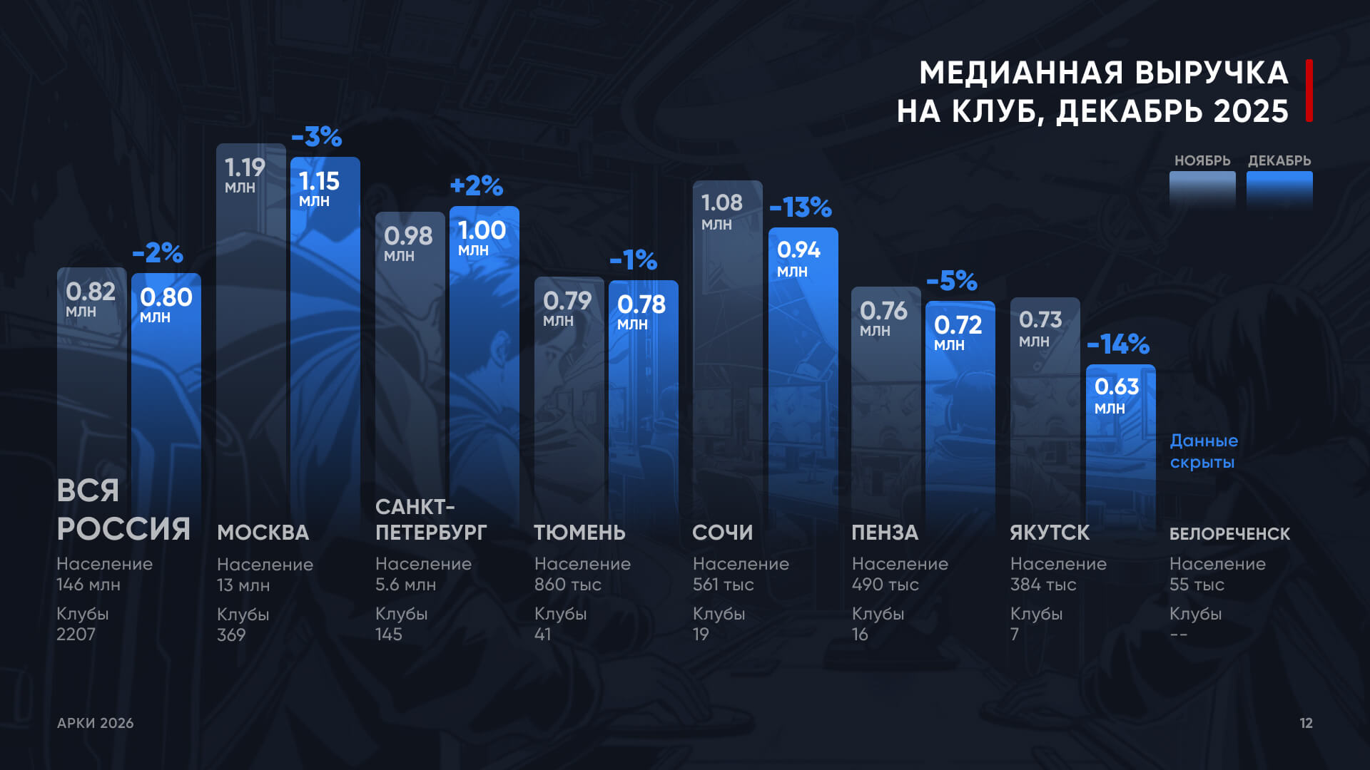 Медианная выручка клуба по РФ колебалась в районе 750 000 рублей. При этом медианная выручка клуба в Москве и медианная выручка клуба в Якутске отличаются всего вдвое, хотя население столицы в 34 раза больше.