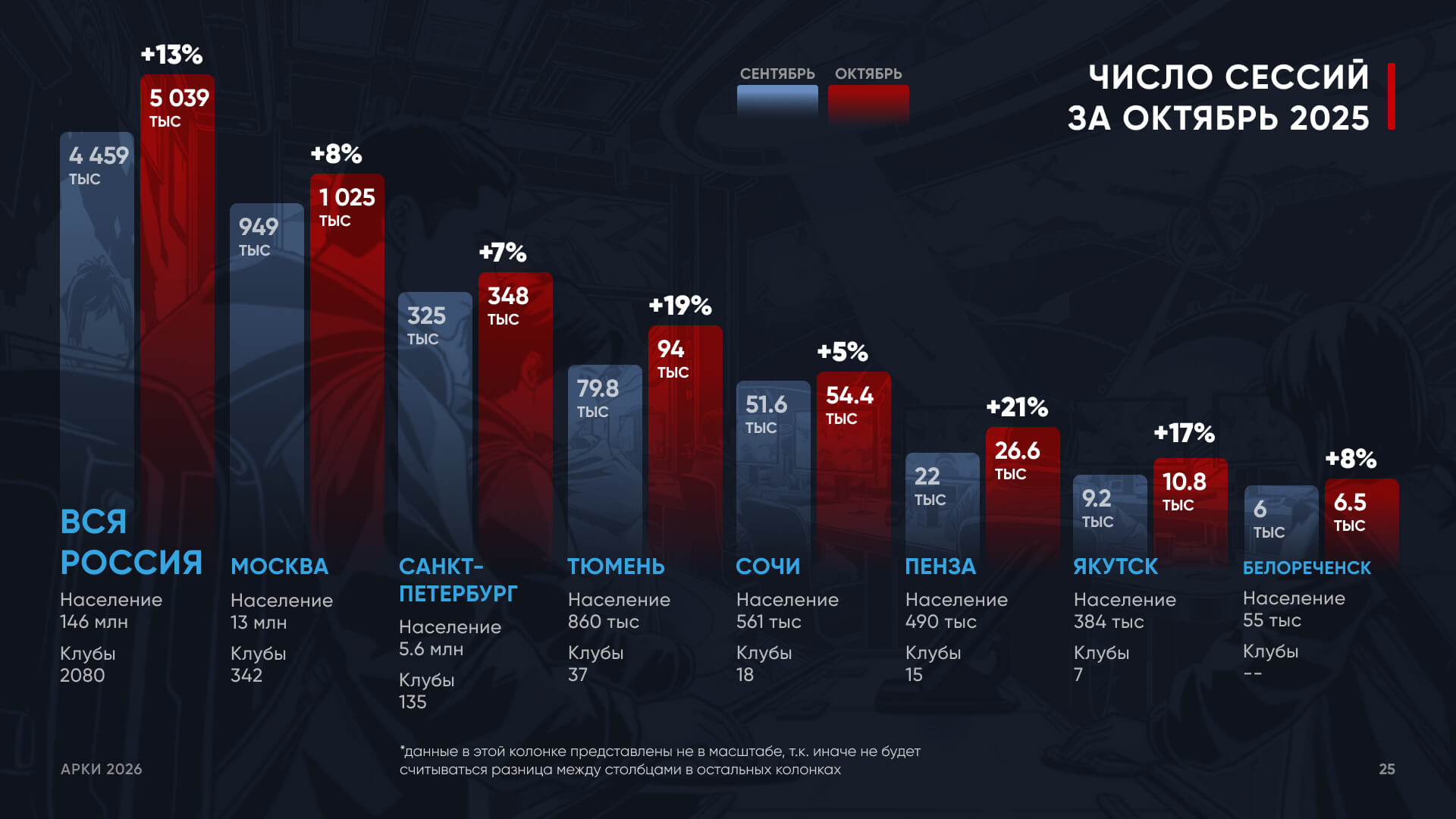 Барометр индустрии компьютерных клубов и киберарен собирается на базе данных, предоставленных партнерами Ассоциации развития киберспортивной инфраструктуры (АРКИ). Это более 2000 компьютерных клубов по всей России, включая крупнейшие франшизы (COLIZEUM, CyberX, Strike Arena), а также экосистема LANGAME и Организация развития видеоигровой индустрии (РВИ). Статистические данные, указанные в отчетах барометра, собраны на базе указанного в соответствующей колонке числа клубов.